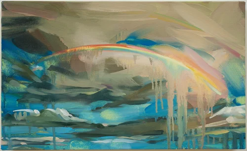 Whether painting rainbows, fireworks or mushroom clouds, the real drama is played out in Campbell’s brushstrokes. Emotionally loaded stories unfold as the brush’s bristles are dragged this way and that. Single strokes often start out as gooey gobs of inchoate matter before quickly segueing into deliberate gestures, only to dissipate into messy meltdowns of mixed tints, flattened volumes, lost textures and, ultimately, bare-canvas emptiness. Whistler’s jaw-dropping nocturnes come to mind but do not overshadow the freewheeling fluidity and existential weight of Campbell’s drop-dead paint handling.