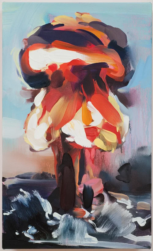 A friend warned me not to paint clowns with the declaration “Everyone hates clowns. No exceptions.” Similar warnings might have been issued for all of the subjects I’ve chosen, mushroom cloud, rainbow, lightning, the nude. They are melodramatic and cliché, almost empty symbols, but they also have different faces. Chancing embarrassment and failure is nothing to uncovering a piece of enormity the image once knew. I am an artist not a doctor. Risk is my obligation. I chase life and death, light, scale, power, and carnality with my brush. These wonders often masquerade as one another and I paint the ring in which they perform.